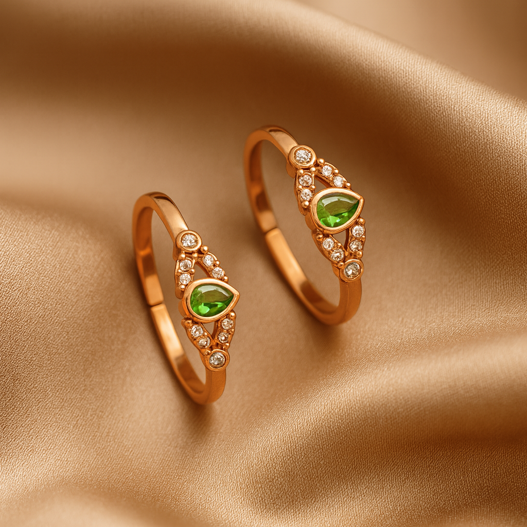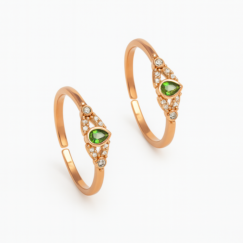 Step into elegance with these 925 Sterling Silver Toe Rings, beautifully finished with a luxurious rose gold plating. Each ring features a striking green teardrop gemstone at the center, surrounded by sparkling cubic zirconia accents, creating a perfect balance of tradition and modern style.