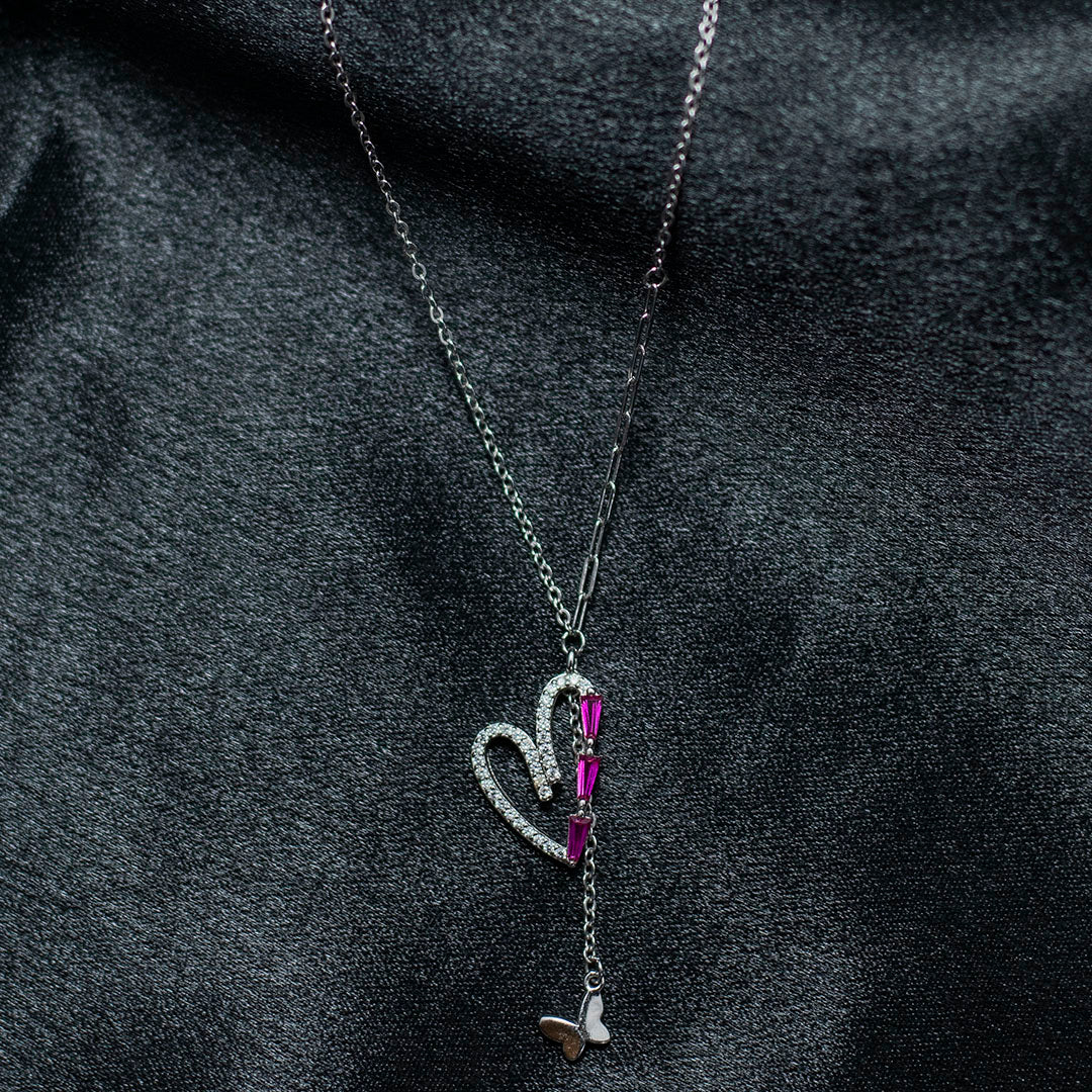 Celebrate elegance and charm with the Amora Heart Butterfly Necklace by Mashha 925 Silver. This exquisite piece features a gracefully designed open heart, half adorned with sparkling cubic zirconia and the other half accented by three vibrant pink baguette stones. A delicate butterfly charm dangles below, adding a whimsical touch to the romantic design.
