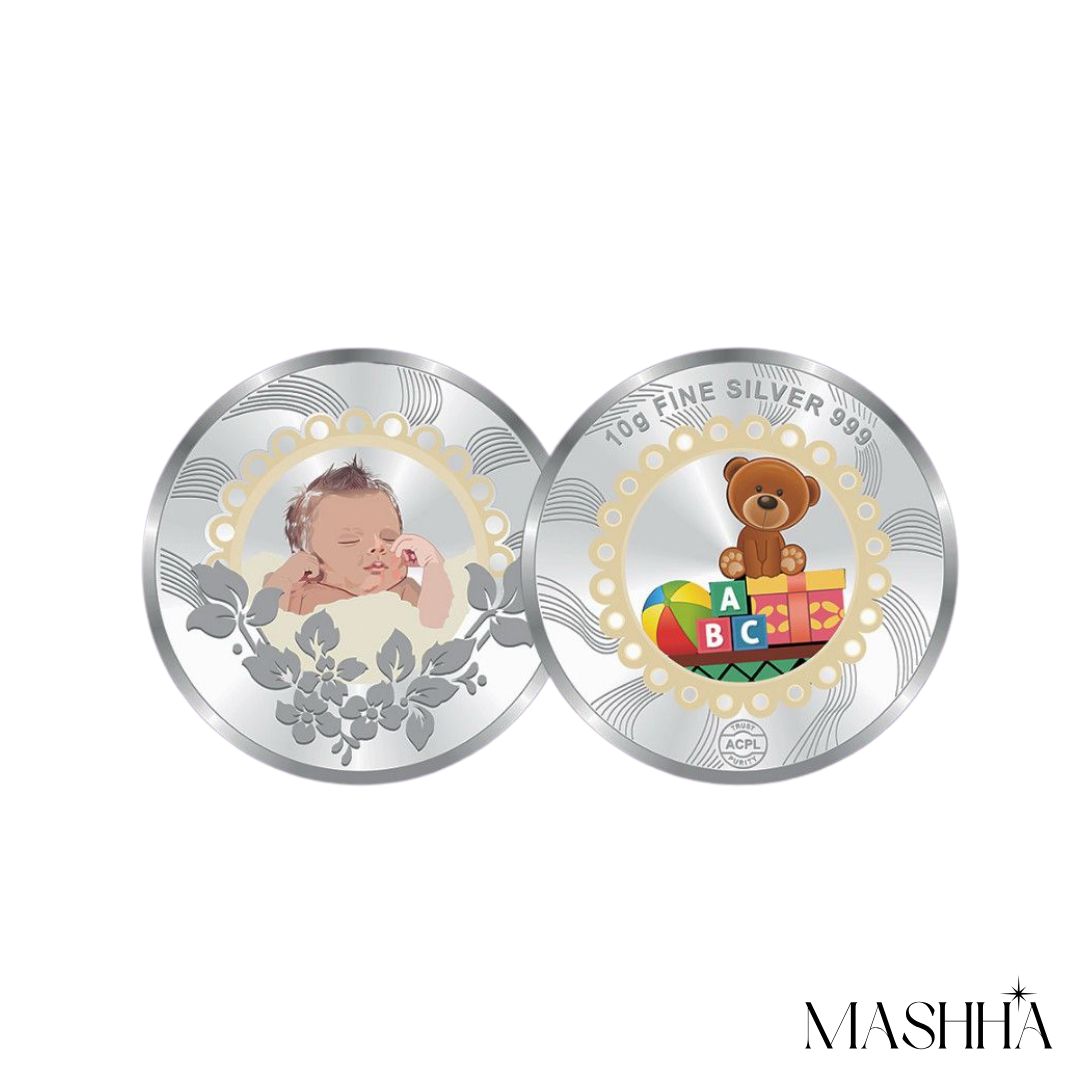 Celebrate the joy of new beginnings with Mashha’s exquisitely crafted 10g Fine Silver Coin (999 purity), designed especially for the little ones. This beautifully illustrated coin features a charming sleeping baby on one side, surrounded by delicate floral detailing in a soft matte-silver finish. The reverse side is playful and colorful, showcasing a cute teddy bear, ABC blocks, a beach ball, and wrapped gifts – perfect symbols of childhood and innocence.