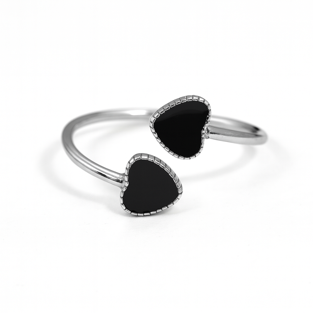 Elevate your everyday elegance with the Black Heart 925 Silver Adjustable Ring by MASHHA — a perfect blend of sophistication and modern romance. Crafted in pure 925 sterling silver, this open-ended ring features dual black heart-shaped stones, delicately framed with fine beaded detailing. The lustrous silver band complements the deep, glossy finish of the hearts, creating a timeless statement piece that embodies both strength and femininity.