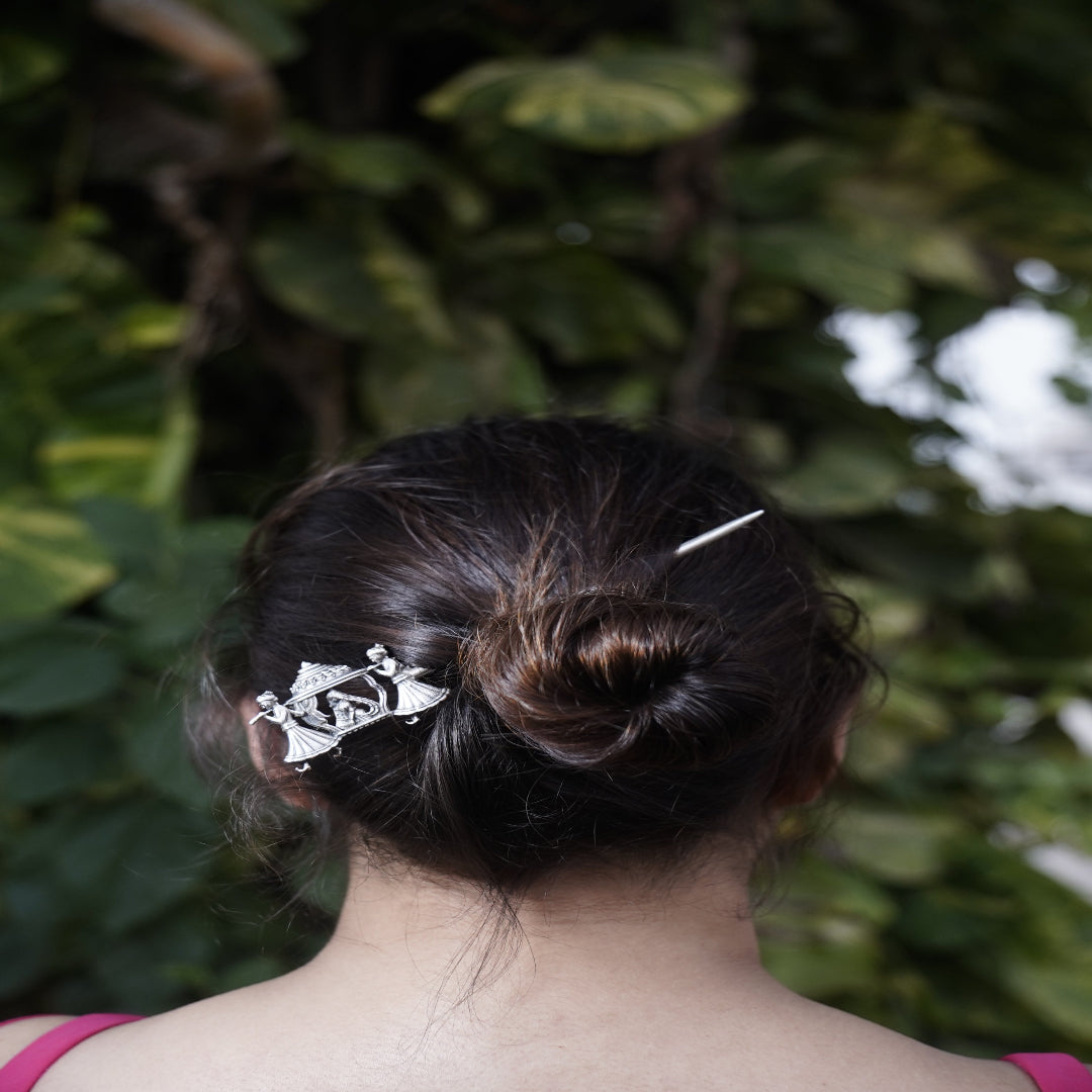 Celebrate tradition and elegance with the Mashha 925 Silver Bridal Doli Hair Accessory — a tribute to timeless Indian heritage. Handcrafted in pure 925 sterling silver, this exquisite piece features a detailed miniature of a bride in a doli (palanquin), gracefully carried by two attendants, capturing the essence of bridal beauty and cultural richness.