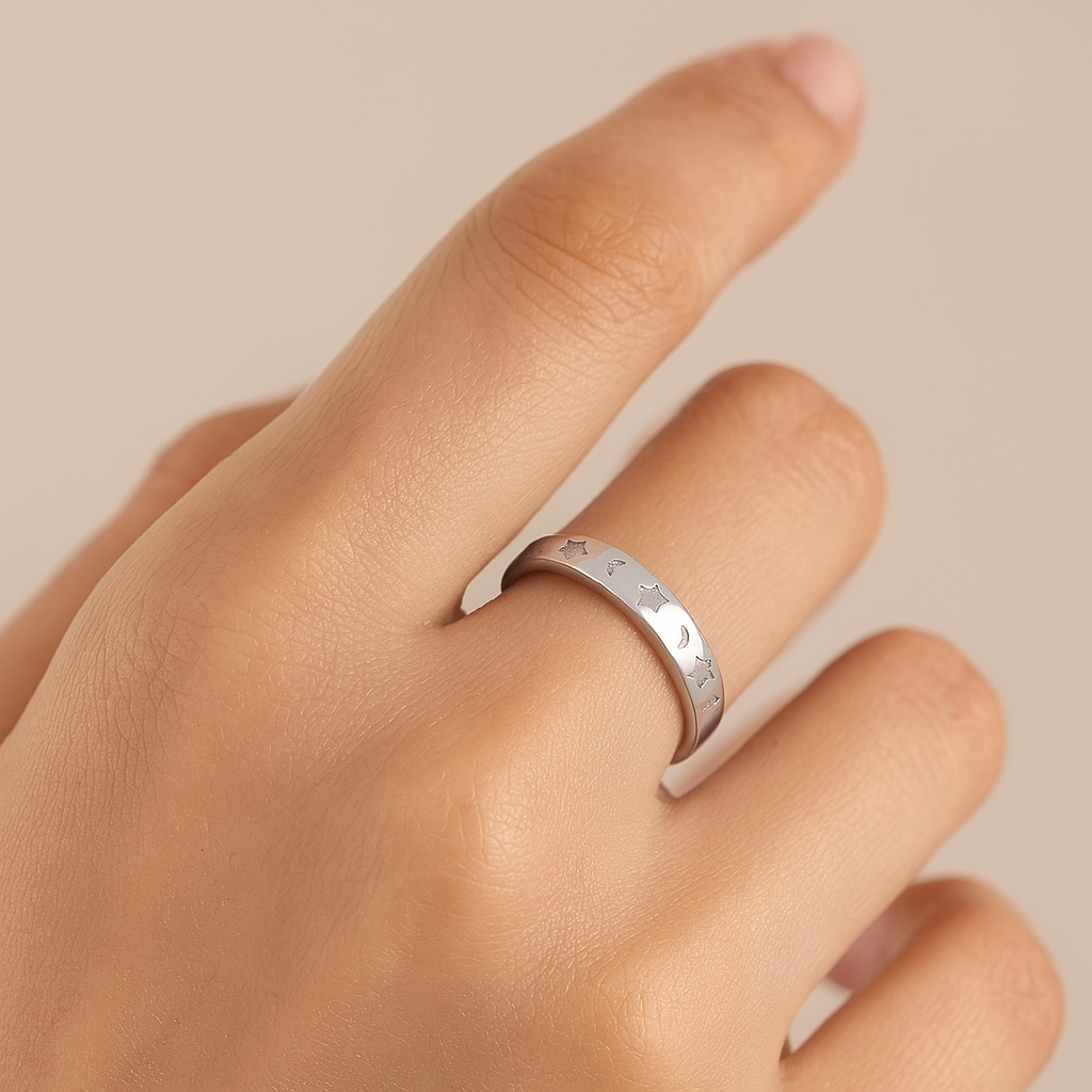 Channel the magic of the night sky with the Mashha 925 Silver Celestial Band Ring. Crafted from pure sterling silver, this sleek band features delicately engraved stars and crescent moons that add a dreamy, cosmic charm to your look. Its smooth, polished finish ensures all-day comfort while making a subtle statement — perfect for those who find beauty in the stars.