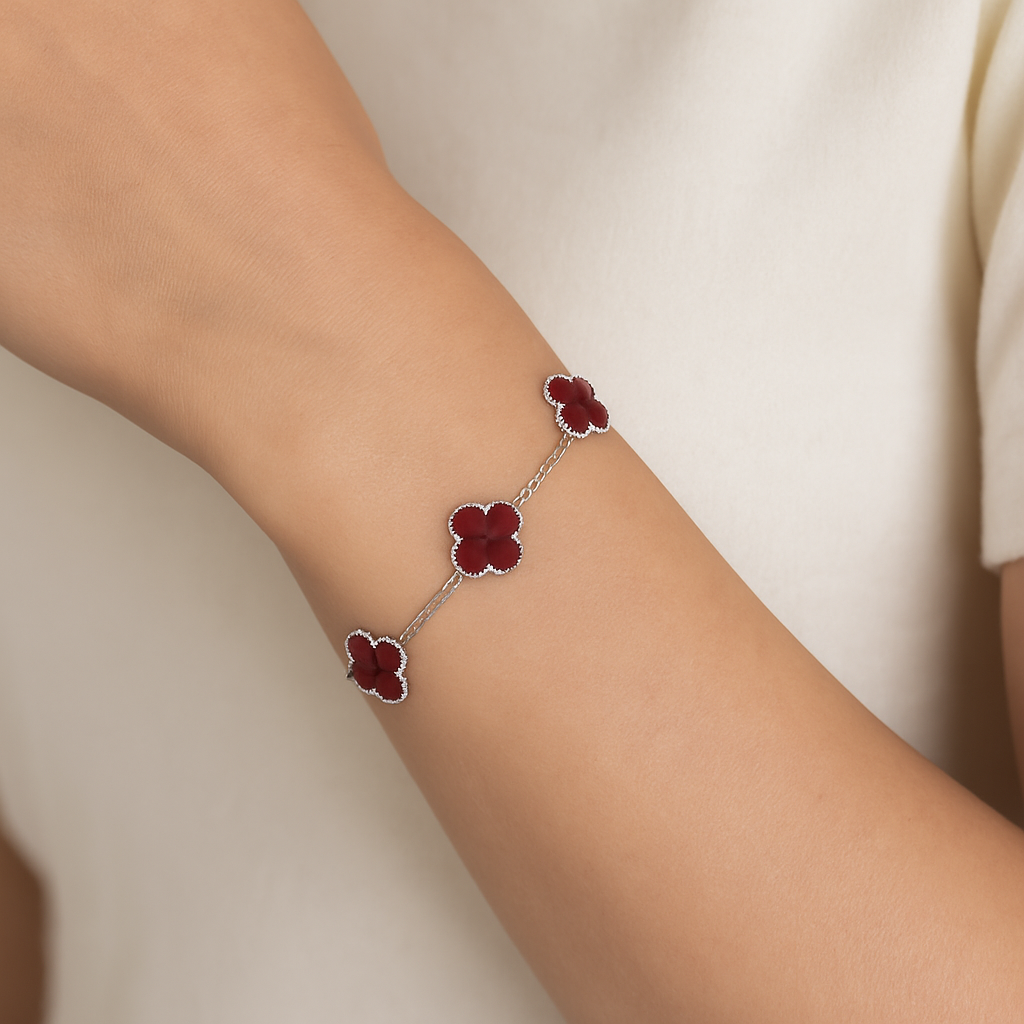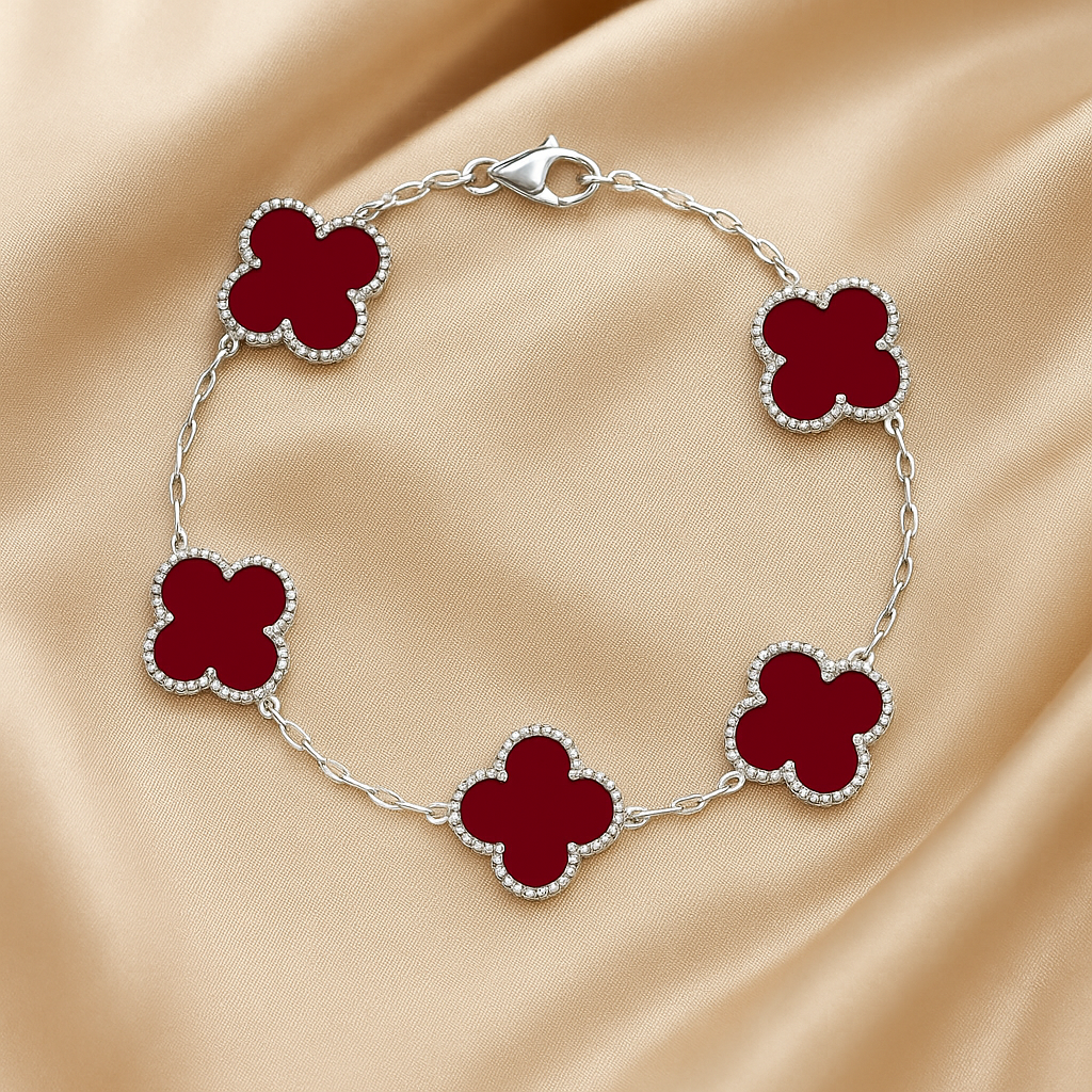 Elevate your elegance with the Crimson Clover 925 Silver Bracelet from Mashha. Crafted from premium 925 sterling silver, this exquisite piece features five deep crimson clover motifs, each delicately bordered with intricate beaded detailing for a luxurious finish. The sleek, fine chain adds a touch of sophistication, making it perfect for both everyday wear and special occasions. Lightweight yet durable, this bracelet effortlessly blends timeless charm with modern style.
