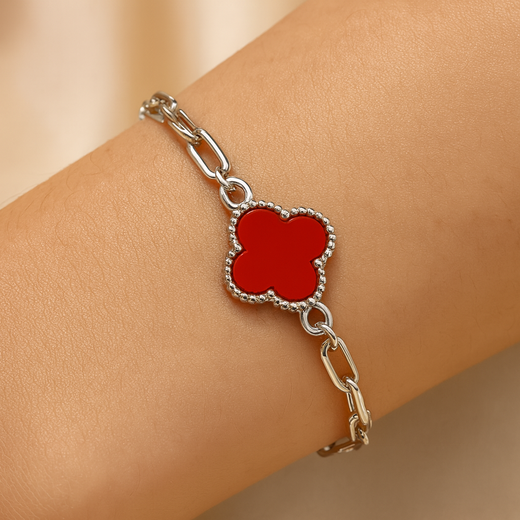 Elevate your style with the Crimson Clover 925 Silver Bracelet by Mashha. Crafted from premium 925 sterling silver, this elegant bracelet features a striking red clover charm framed with delicate detailing, symbolizing luck and timeless elegance. The modern linked chain design ensures durability and comfort, while the adjustable clasp provides a perfect fit for everyday wear or special occasions.