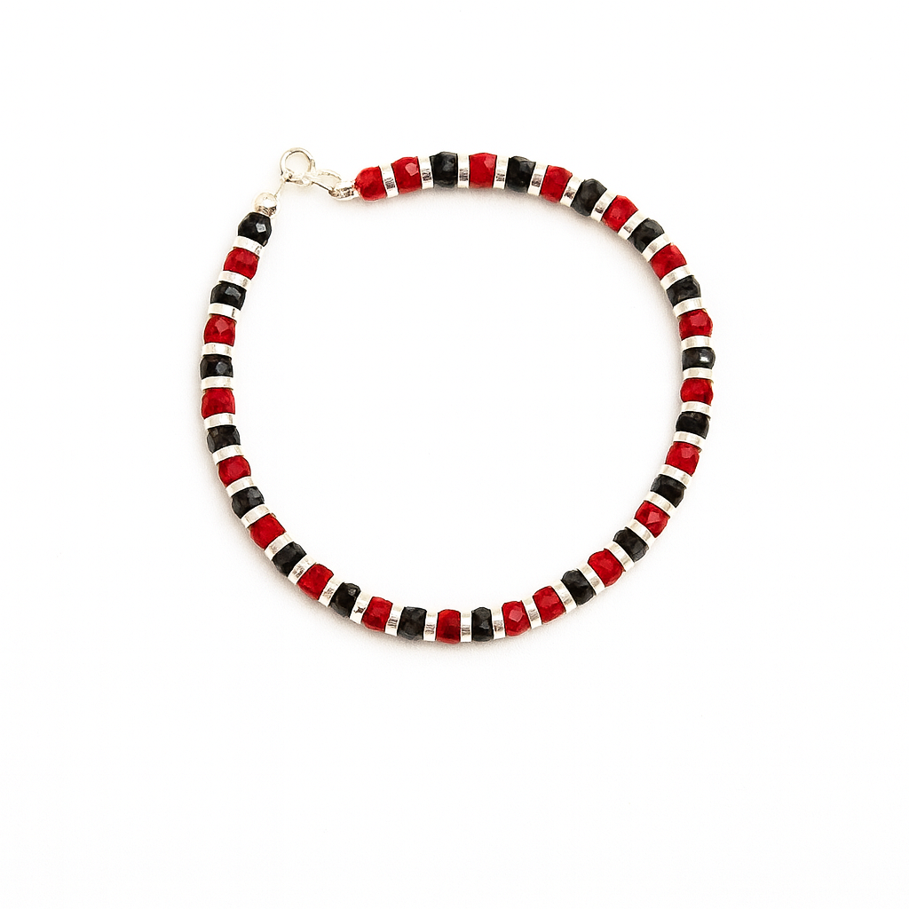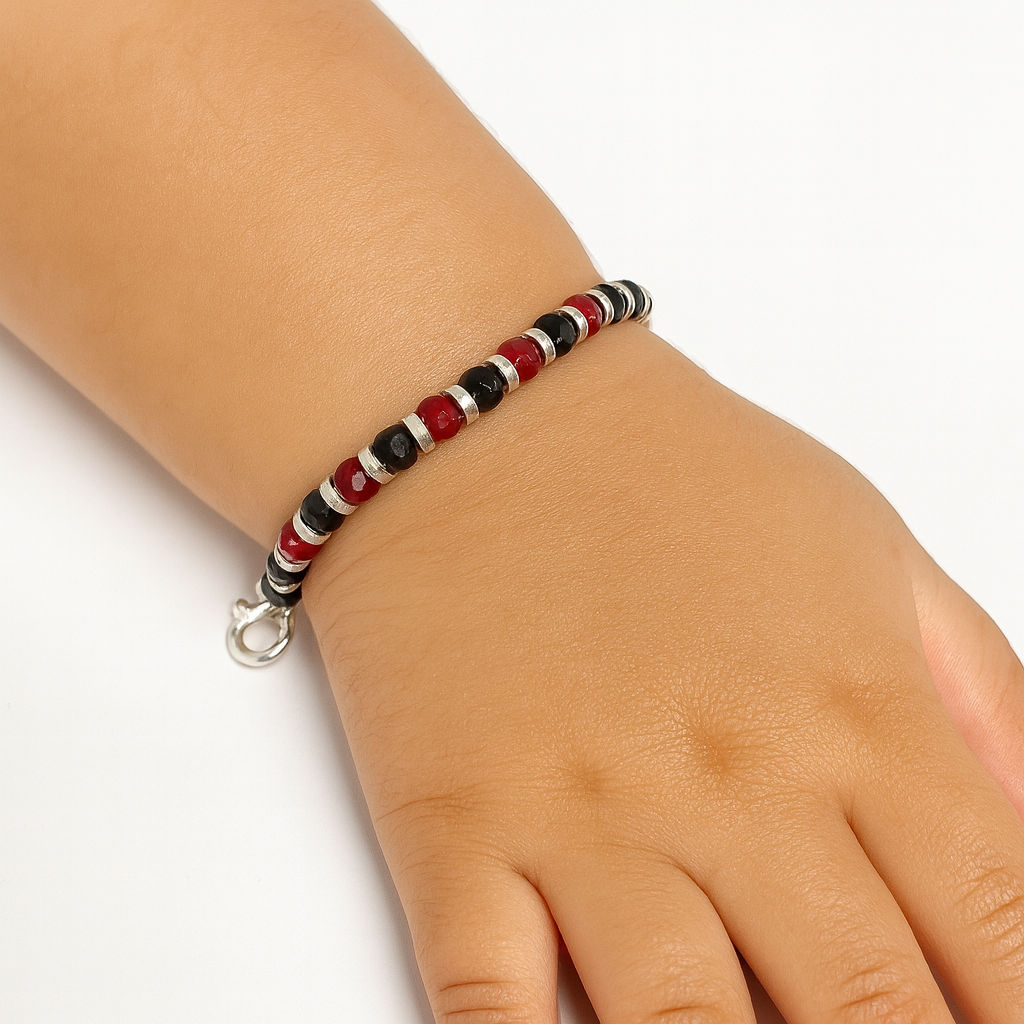 Add a pop of color and elegance to your little one’s style with the Crimson Noir Beaded Silver Bracelet from Mashha. Crafted with alternating red and black faceted beads, delicately set between pure 925 silver spacers, this bracelet strikes the perfect balance of tradition and modern charm. The vibrant beads sparkle with every movement, while the durable silver clasp ensures a secure and comfortable fit.