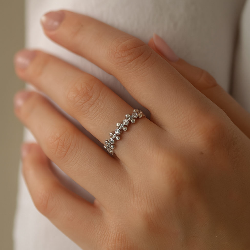Playful yet elegant, the Daisy Chain Band is a charming addition to your jewelry collection. Crafted in pure 925 sterling silver, this dainty ring features a delicate floral-inspired design, with petite open loops surrounding shimmering zircons, forming a continuous garland of sparkle. Light, feminine, and perfect for stacking, it brings a whimsical grace to your everyday or festive look.