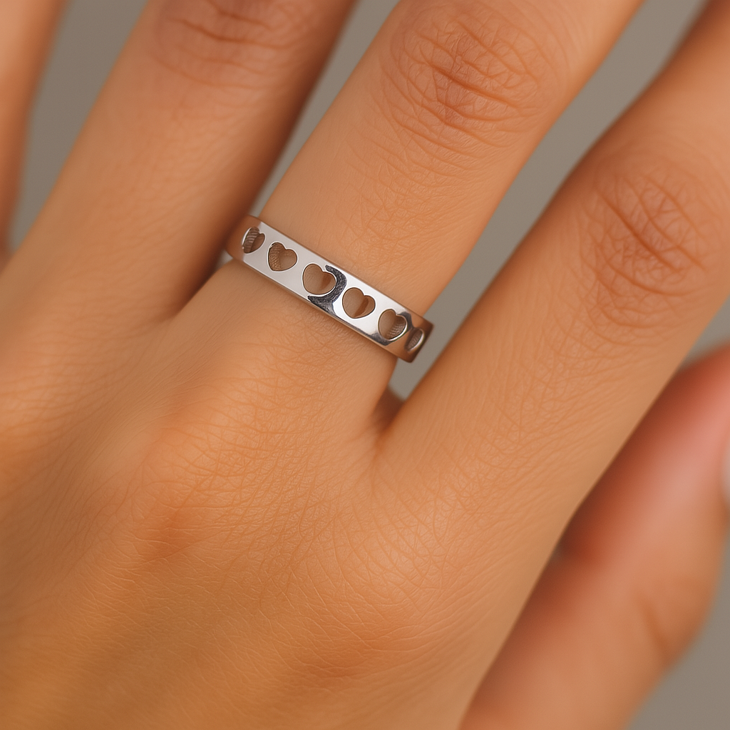 Simple, sweet, and symbolic — the Eternal Hearts Band by Mashha is a timeless piece crafted in pure 925 sterling silver. Designed with a series of delicate heart-shaped cutouts all around the band, this ring beautifully represents love, unity, and connection. Its clean lines and polished finish make it perfect for everyday elegance or a thoughtful gift for someone close to your heart.