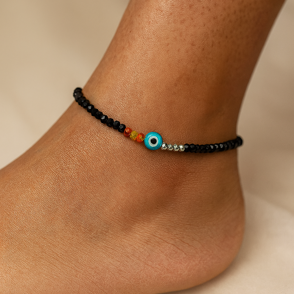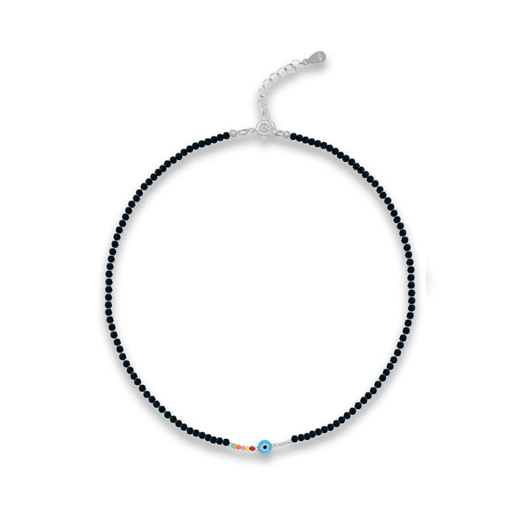 Add a touch of elegance and protection to your style with this handcrafted Masha925 silver anklet. Featuring a stunning combination of faceted black beads, vibrant multicolored accents, and a signature turquoise evil eye charm, this anklet blends traditional symbolism with modern design. Finished with a sterling silver clasp and extension chain for adjustable comfort, it’s perfect for everyday wear or special occasions.