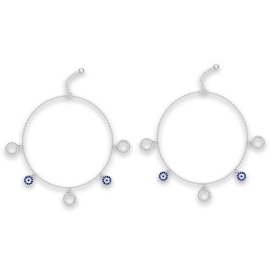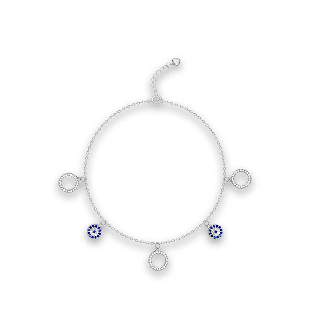 Add a graceful charm to every step with the Mashha 925 Silver Evil Eye Harmony Anklet. Featuring a delicate silver chain adorned with alternating circular zirconia hoops and deep blue evil eye-inspired charms, this anklet offers the perfect blend of tradition and trend. The shimmering evil eye motifs are believed to protect and bring good fortune, while the minimalist open-circle designs add a contemporary twist.