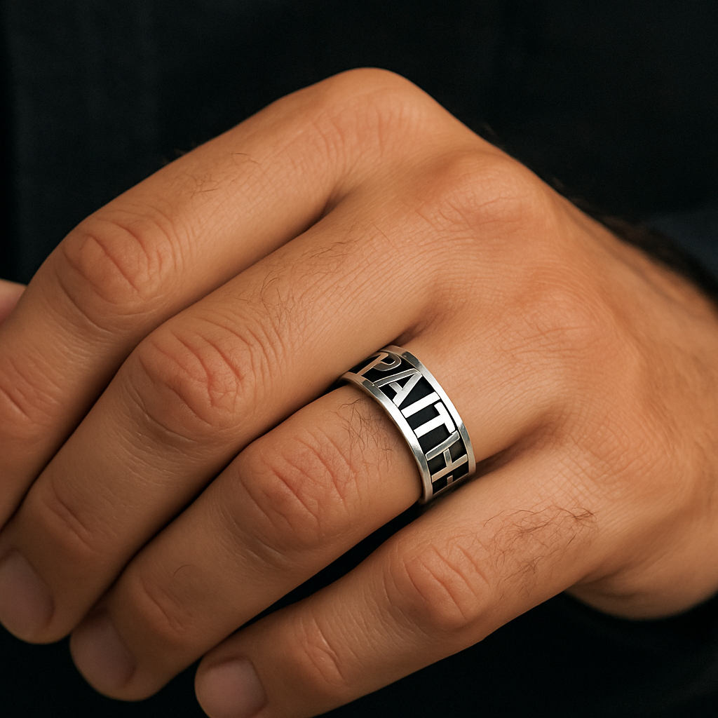 A powerful expression in minimal design — the FAITH Cut-Out Band by Mashha is crafted in pure 925 sterling silver, featuring bold cut-out lettering that wraps around the finger in a seamless statement of strength and belief. With a sleek high-polish finish and comfortable fit, this unisex ring speaks volumes without saying a word. Wear it solo or stack it with other Mashha pieces for a look that's uniquely yours.
