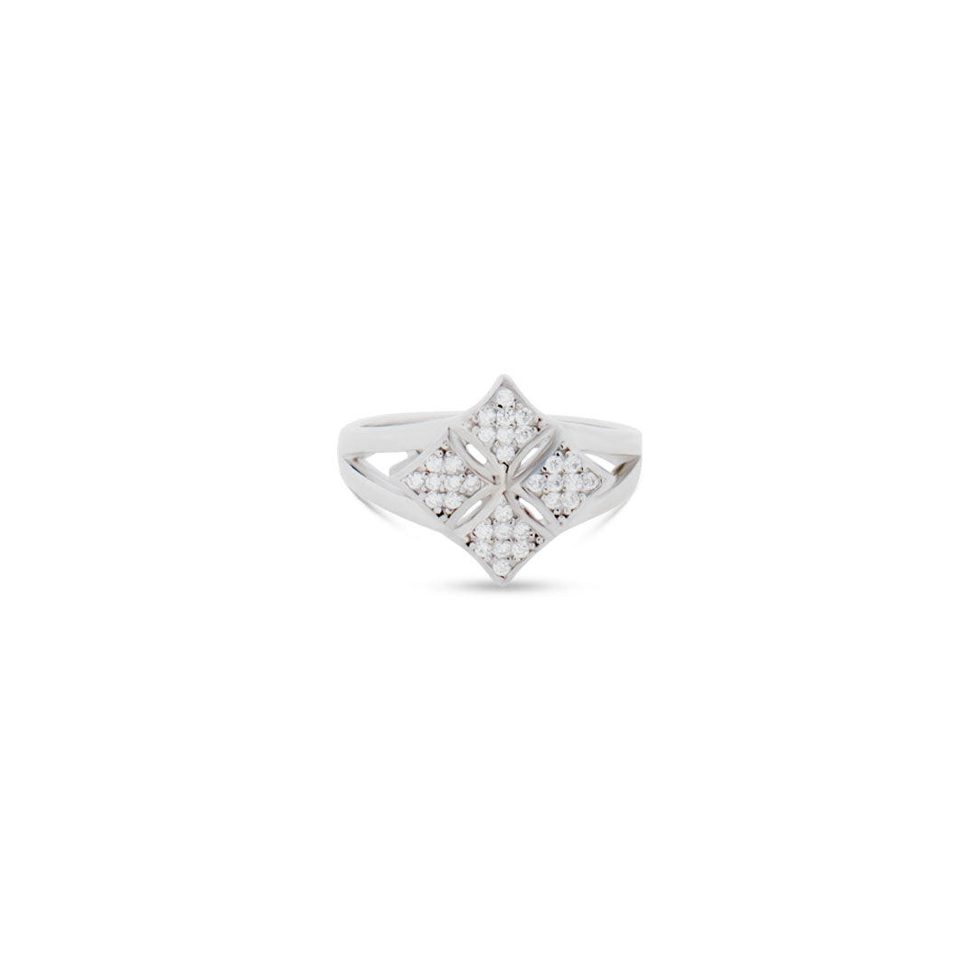 Elevate your style with this contemporary 925 sterling silver ring, featuring a unique diamond-shaped design divided into four sparkling quadrants. Each section is adorned with radiant cubic zirconia stones, creating a brilliant, eye-catching look. The split band adds a modern touch, making this piece perfect for everyday wear or special occasions where subtle sophistication is key.