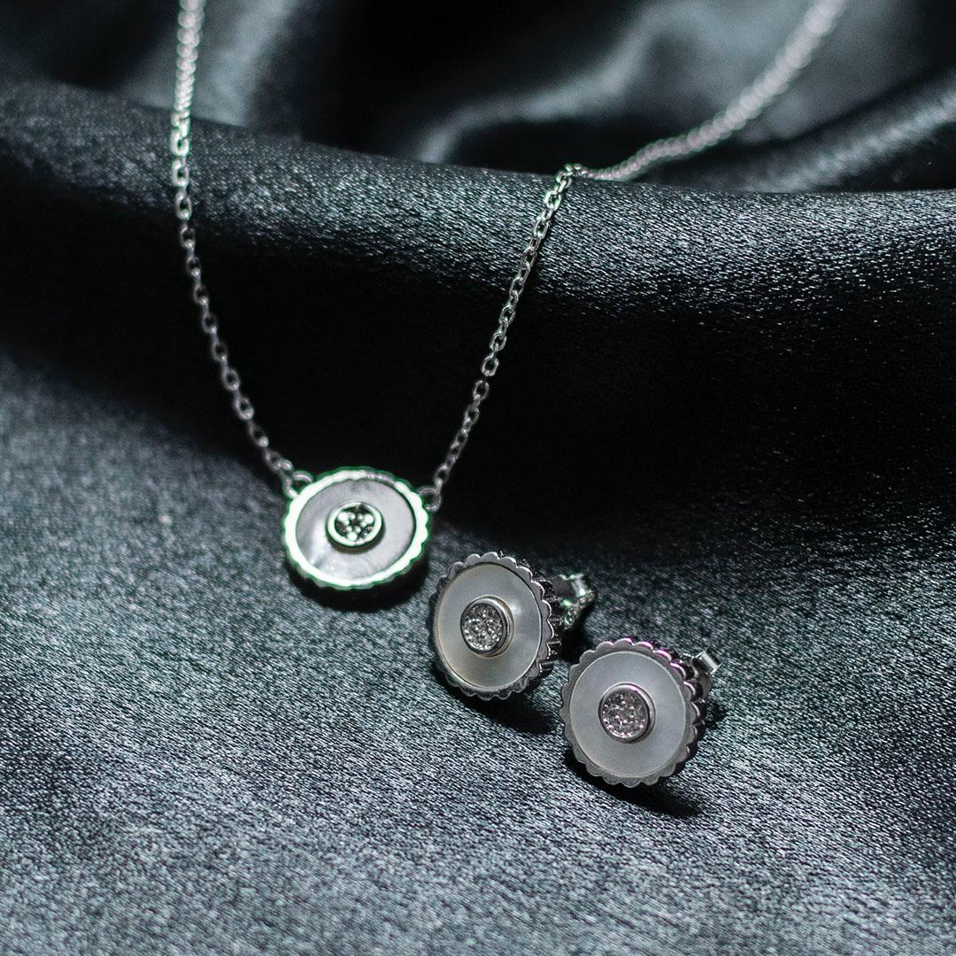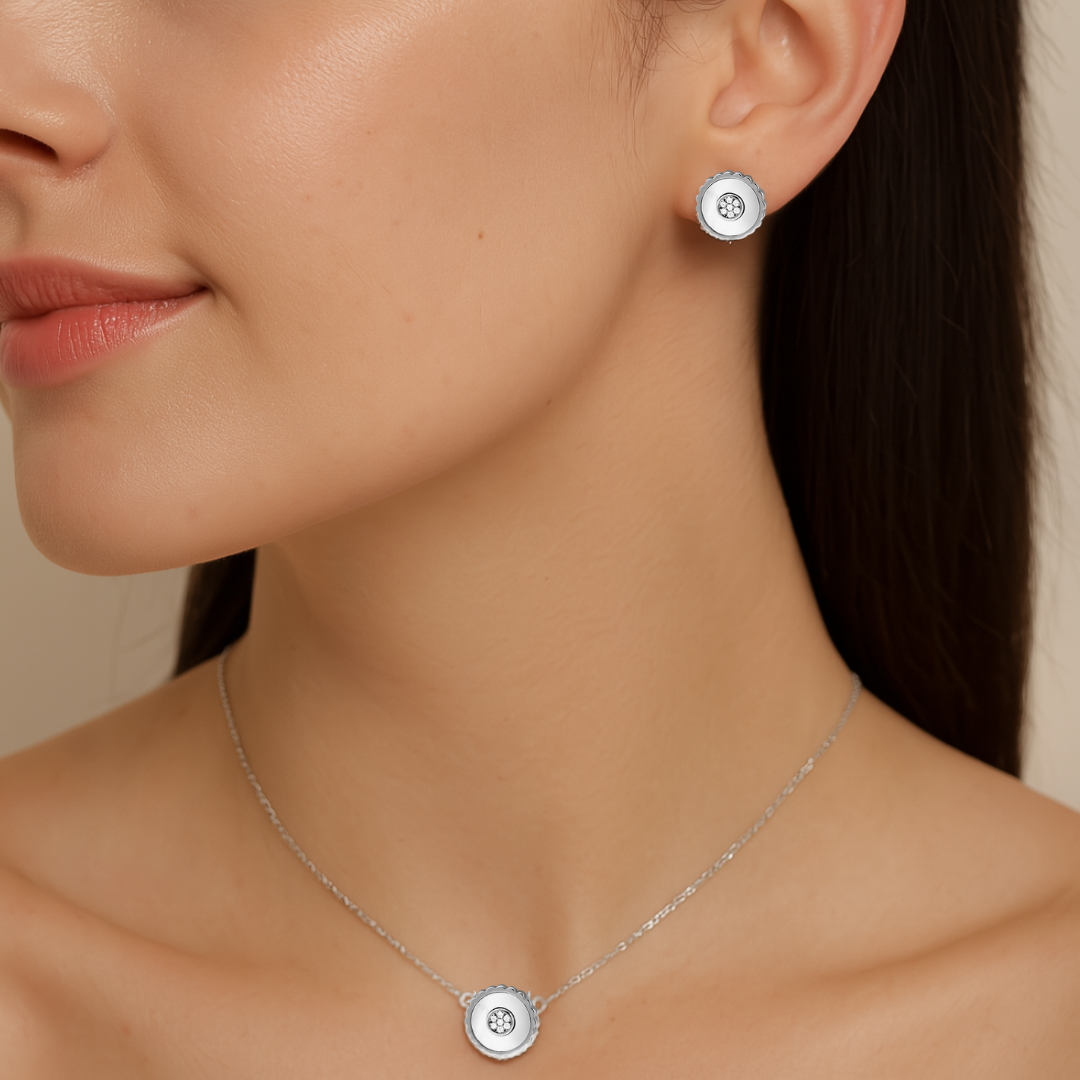 Inspired by the soft glow of moonlight and the delicate bloom of a petal, the Luna Bloom Set is a stunning 925 silver ensemble that radiates effortless charm. The round pendant and earrings feature scalloped edges and a brilliant cluster of CZ stones at the center, creating a look that's both timeless and modern.
