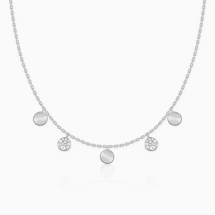 Elevate your everyday elegance with the Mashha 925 Silver Necklace, an exquisite piece crafted in pure 925 sterling silver. This delicate necklace features five dainty dangling discs — a perfect harmony of high-polish silver and dazzling pavé-set stones that catch the light with every movement.