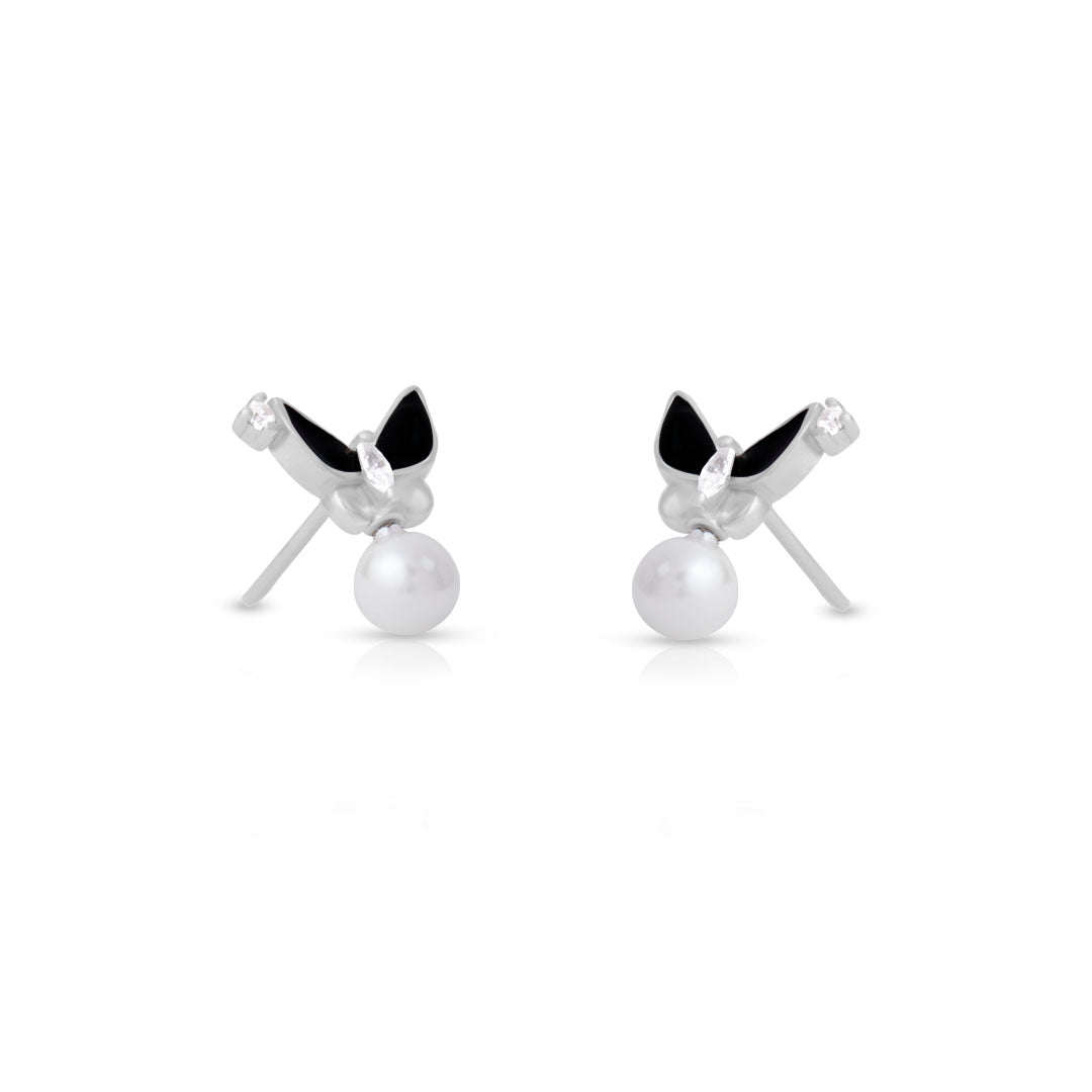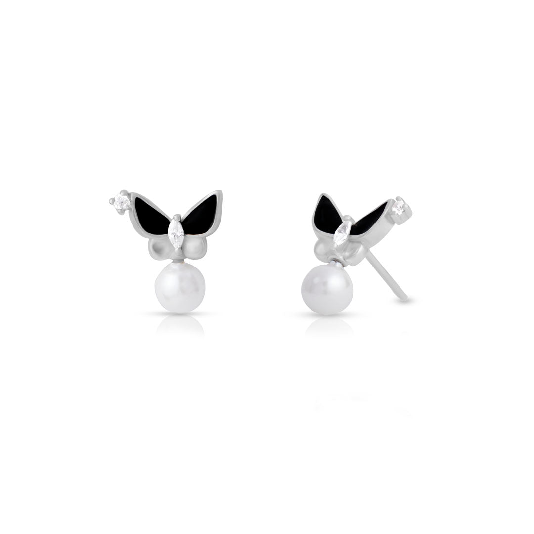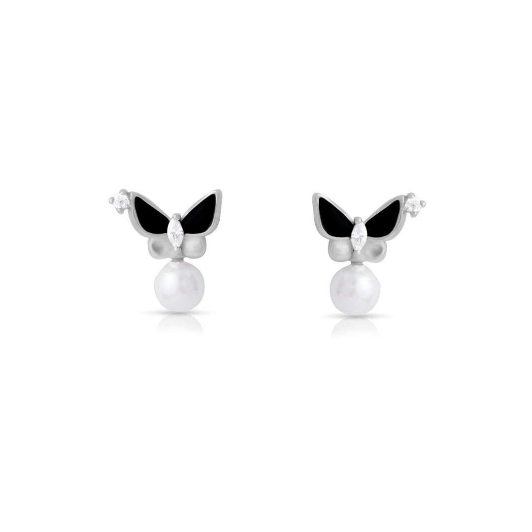 Make a statement with the Midnight Pearl Butterfly Studs from Mashha — where bold design meets timeless elegance. Crafted in hallmarked 925 sterling silver, these earrings feature a chic black enamel butterfly accented with a marquise-cut cubic zirconia body and a sparkling stone at the wing tip. A luminous white pearl drop completes the look, adding a graceful touch of sophistication.