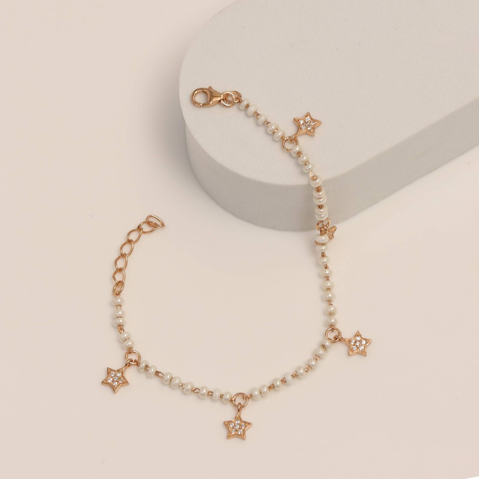 Add a sprinkle of celestial magic to your jewelry collection with the Stellar Charm Bracelet. Crafted from high-quality 925 sterling silver and adorned with a soft gold finish, this bracelet features a graceful strand of freshwater pearls punctuated by five delicate star-shaped charms. Each charm is encrusted with sparkling cubic zirconia stones, catching the light with every movement.