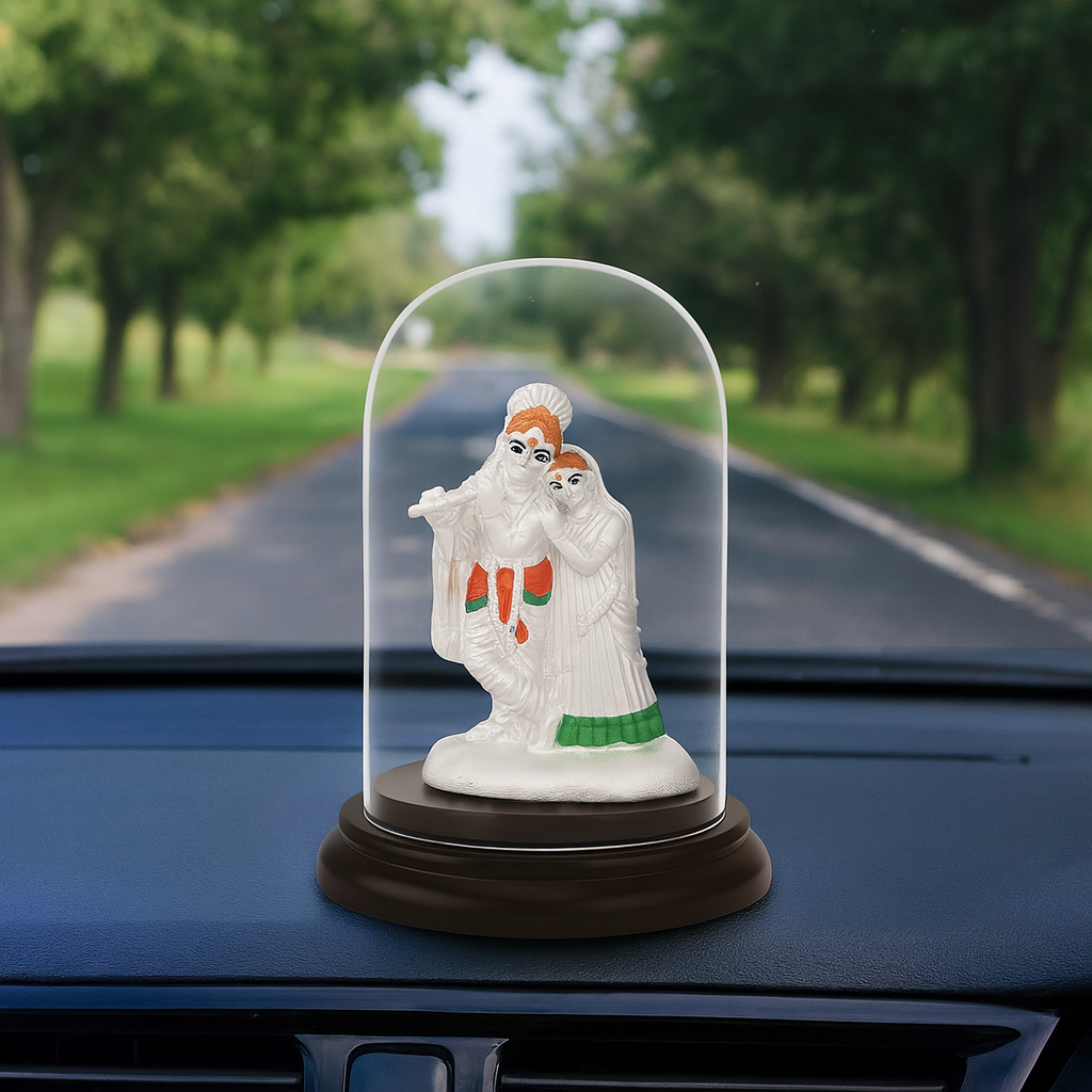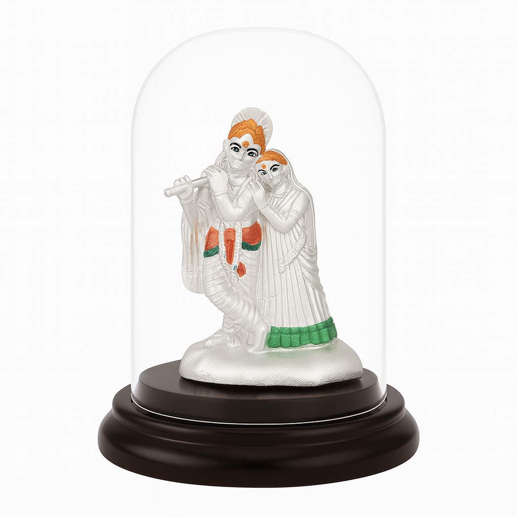 Crafted with 99.9% pure silver, this exquisite idol of Radha Krishna captures divine love and serenity in every detail. Encased in a protective dome, the idol features vibrant hand-painted accents in orange, green, and black, adding charm to its intricate design. Perfect for placing in your home temple, gifting for auspicious occasions, or keeping as a spiritual keepsake, this idol radiates blessings and positivity wherever it is placed.