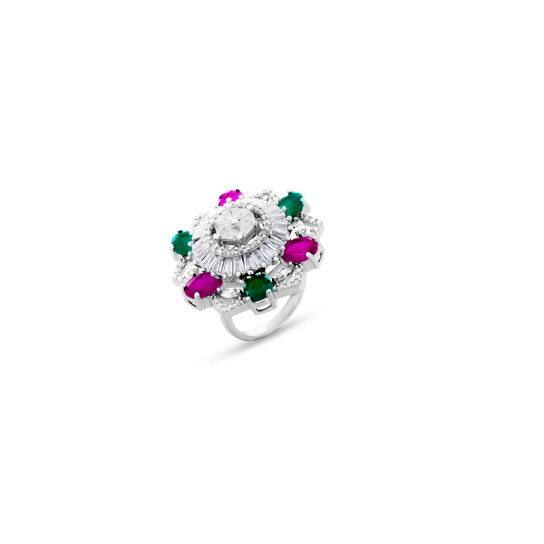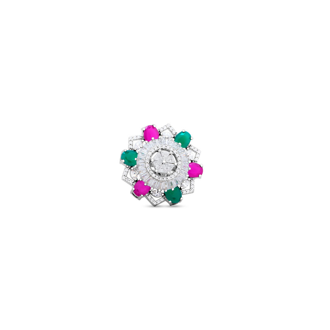 Step into the spotlight with our Regal Bloom Cocktail Ring from Mashha 925 Silver. Crafted in pure 925 sterling silver, this statement piece features a radiant floral-inspired design, centered around a brilliant-cut CZ diamond that catches the light with every gesture. The petals bloom with alternating hues of vibrant ruby-pink and emerald-green stones, encircled by shimmering baguette and round-cut accents for added brilliance.
