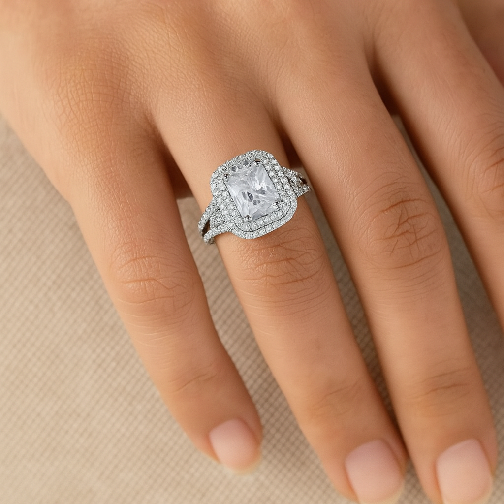 Make a bold statement with this luxurious 925 sterling silver ring, featuring a dazzling emerald-cut centerpiece surrounded by a double halo of brilliant cubic zirconia. The split shank design is embellished with pavé-set stones and a sparkling side-circle detail, adding extra elegance and dimension. Perfect for special occasions or adding a touch of glamour to your everyday look, this ring is all about timeless sophistication and brilliance.