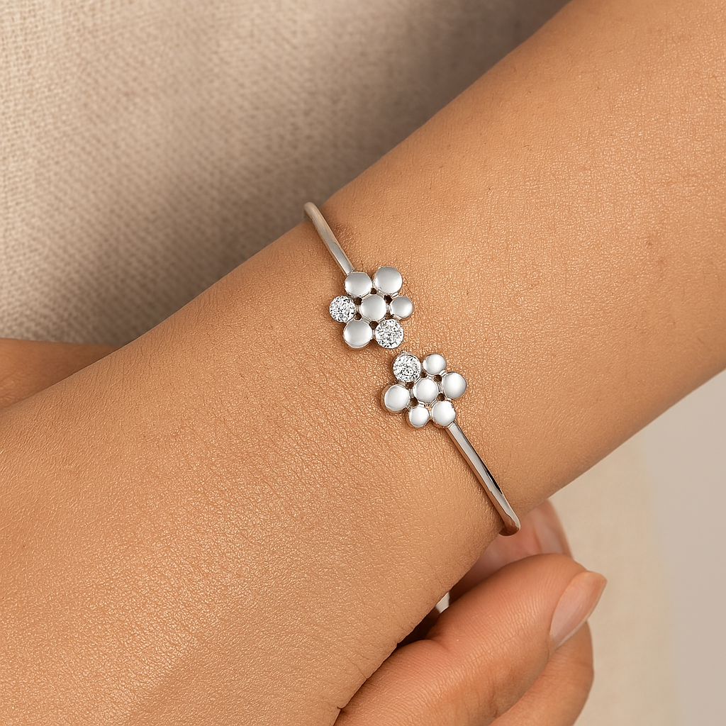 Design: Open bangle with dual floral clusters
