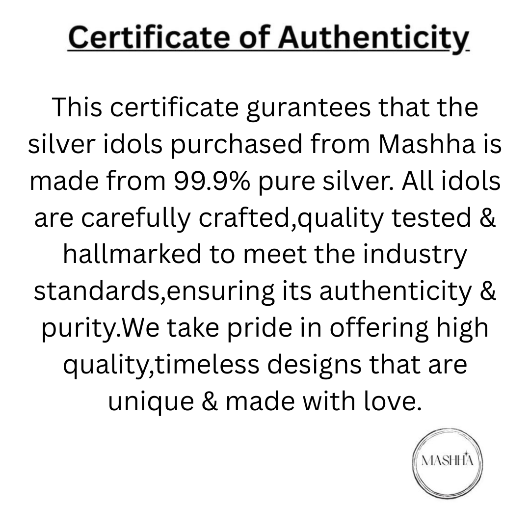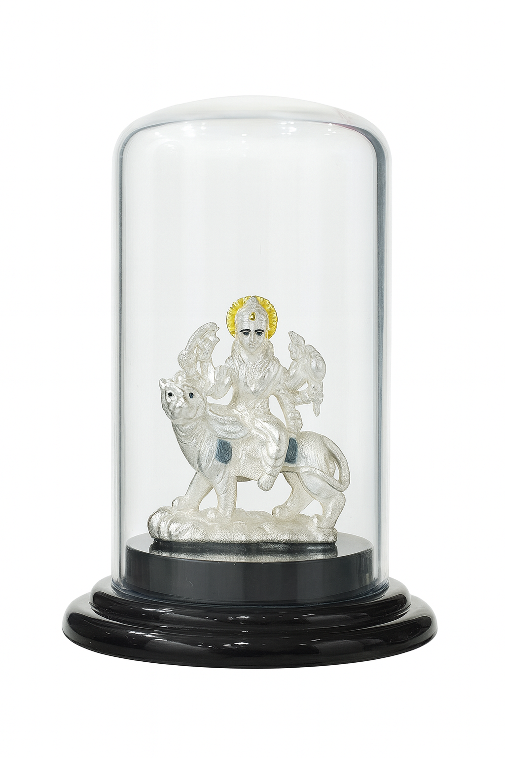 Experience divine grace and blessings with this beautifully crafted Silver Durga Idol. Made with precision in 99.9% pure silver, the idol depicts Goddess Durga seated majestically on a lion, symbolizing strength and protection.
