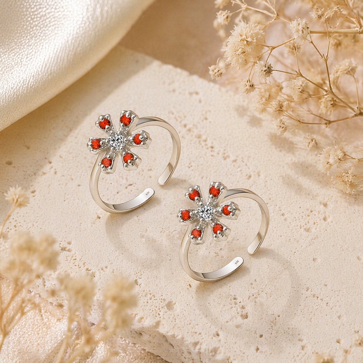 Step into floral fantasy with this beautifully crafted Mashha 925 Silver Toe Ring, designed in the shape of a radiant six-petal flower. Each petal glistens with a vivid red stone, while the sparkling white center adds a touch of brilliance to your feet. Made with genuine 925 sterling silver, the open adjustable band ensures a comfortable and secure fit.