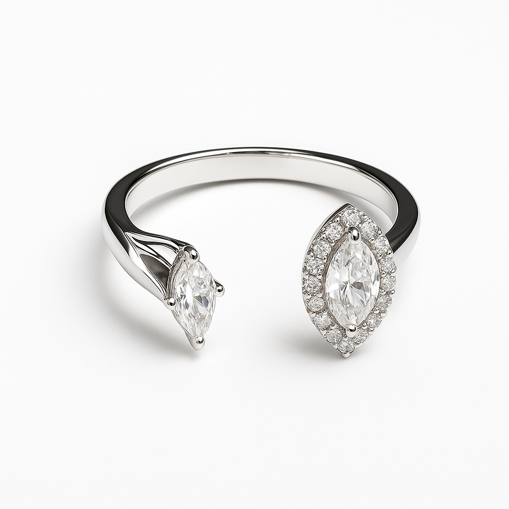 Elevate your elegance with the stunning Masha925 Sterling Silver Ring – a graceful blend of modern design and timeless sparkle. Crafted from premium 925 sterling silver, this open-ended ring features two captivating marquise-cut cubic zirconia stones. One side showcases a solitaire marquise stone nestled in a sleek prong setting, while the other dazzles with a larger marquise centerpiece encircled by a halo of shimmering pavé stones.
