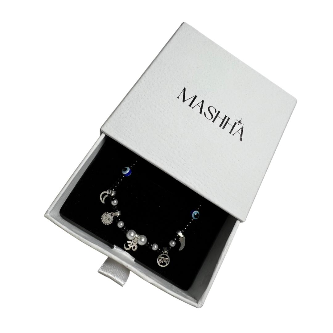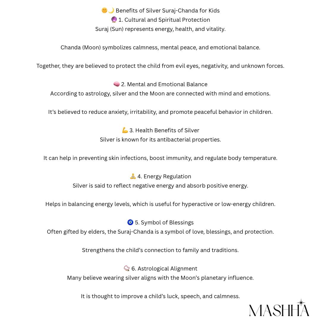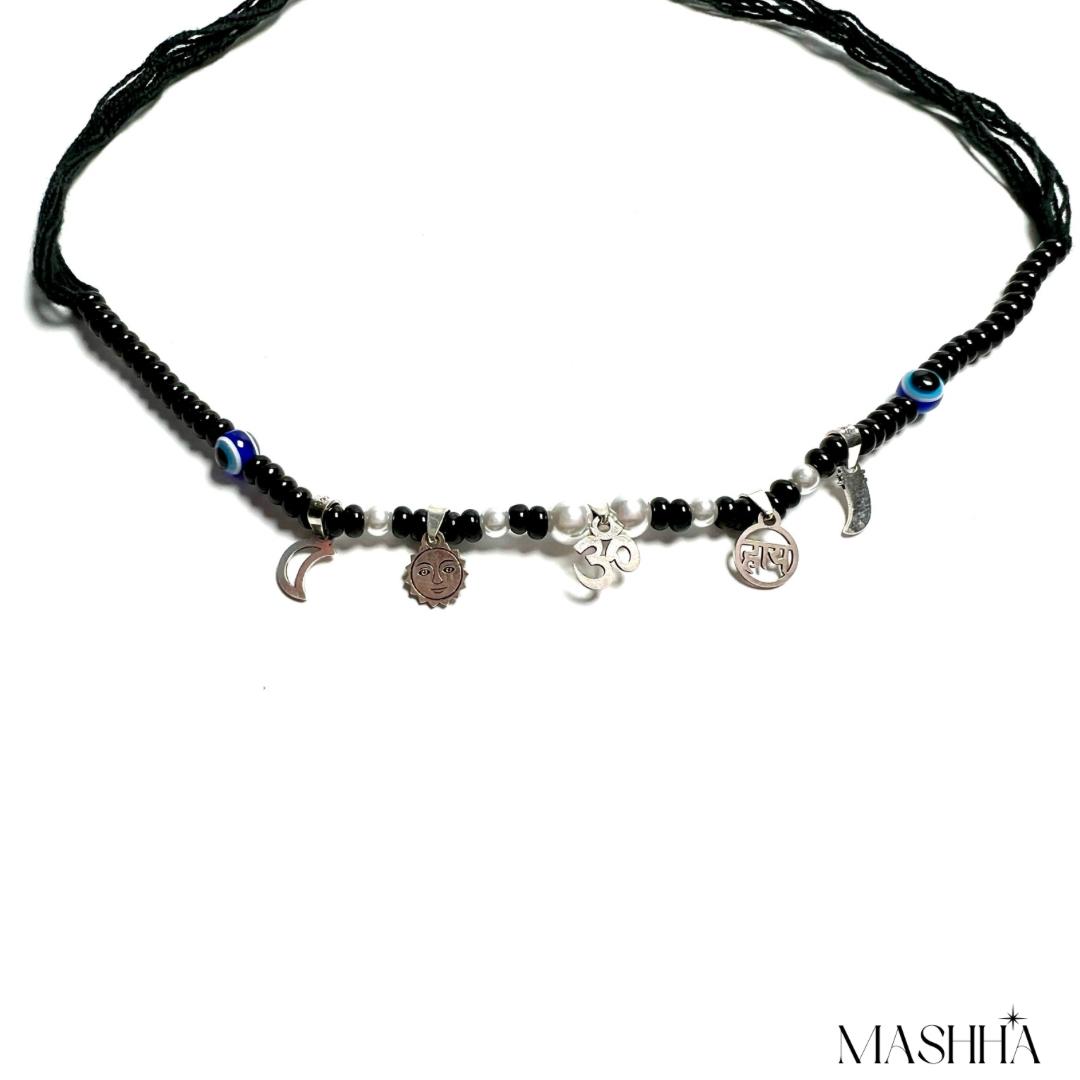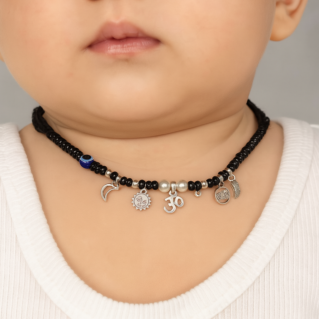 Wrap your little one in the warmth of tradition and the purity of silver with Mashha's Suraj Chanda Haye, a handcrafted black thread necklace designed especially for kids.