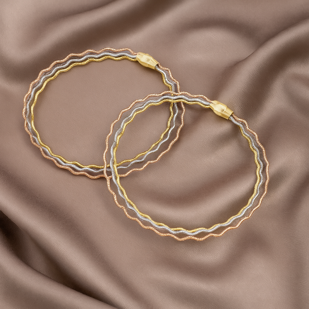 Crafted from premium 925 silver with a luxurious gold and rose gold finish, this elegant anklet features three beautifully textured wavy layers that create a bold yet graceful look. Designed with a secure clasp, the tri-tone design effortlessly blends classic silver with warm golden hues, making it a versatile accessory for both casual and festive wear.