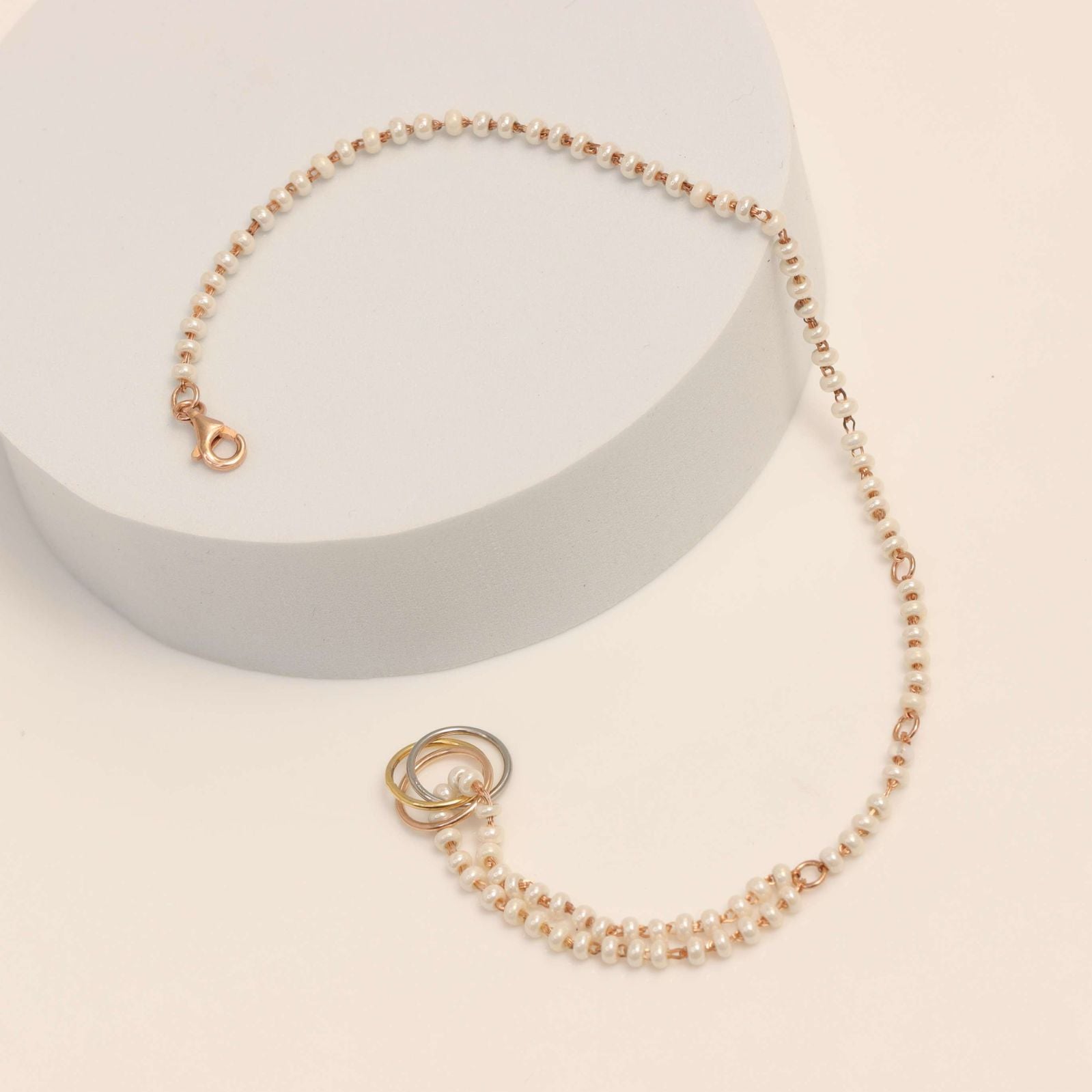 Graceful, modern, and timeless — the Masha Bracelet brings understated luxury to your wrist with its exquisite design. Handcrafted from high-quality 925 sterling silver and finished in a soft gold tone, this bracelet features a single strand of luminous freshwater pearls complemented by a unique trio of interlocking rings in gold, rose gold, and silver finishes.